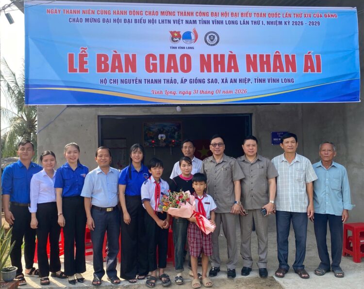 (NCPLĐTO) – Sáng ngày 31/01/2026, Ban Thường vụ Tỉnh đoàn, Ban Thư ký Ủy ban Hội LHTN Việt Nam tỉnh Vĩnh Long đã phối hợp Hiệp hội Nghiên cứu, Tư vấn về Chính sách, pháp luật cho hoạt động đầu tư tại Việt Nam (AVRCIPL); Viện Nghiên cứu Thị trường – Truyền thông Quốc tế (IMRIC) và Viện Nghiên cứu Chính sách pháp luật&Kinh tế hội nhập (IRLIE) tổ chức Lễ bàn giao công trình Nhà nhân ái cho hộ gia đình chị Nguyễn Thanh Thảo – gia đình có hoàn cảnh khó khăn về nhà ở tại ấp Giồng Sao, xã An Hiệp, tỉnh Vĩnh Long. Công trình chào mừng thành công Đại hội Đại biểu toàn quốc lần thứ XIV của Đảng và chào mừng Đại hội Đại biểu Hội LHTN Việt Nam tỉnh Vĩnh Long lần thứ I, nhiệm kỳ 2026 – 2029.