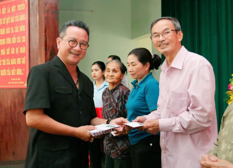 Ông Hồ Minh Sơn và ông Phan Ngọc Tuấn trao quà cho người dân
