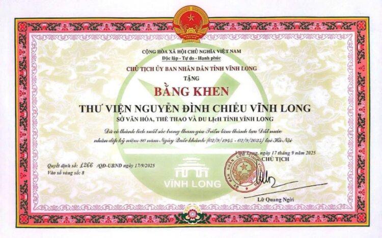 UBND tỉnh tặng Bằng khen cho tập thể Thư viên Nguyễn Đình Chiểu Vĩnh Long“Đã có thành tích xuất sắc trong tham gia Triển lãm thành tựu Đât nước nhân dịp kỷ niệm 80 năm Ngày quốc khánh (02/9/1945 -02/9/2025) tại Hà Nội”